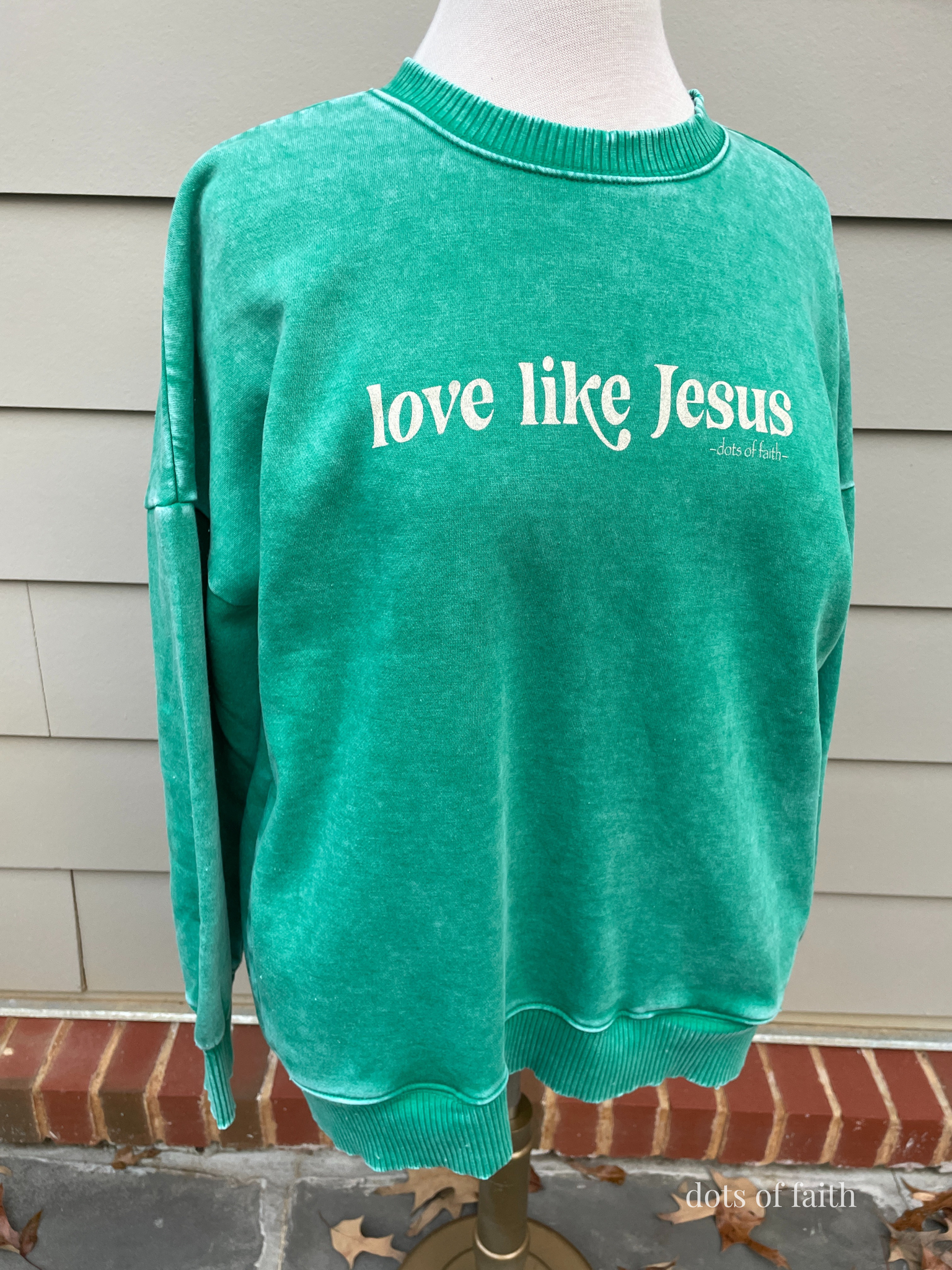 “Love Like Jesus” means showing others kindness, grace, and love the way Jesus does. gorgeous kelly green acid wash, won't fade!! oversized cut, size down if between sizes. poly/cotton. screen printed.