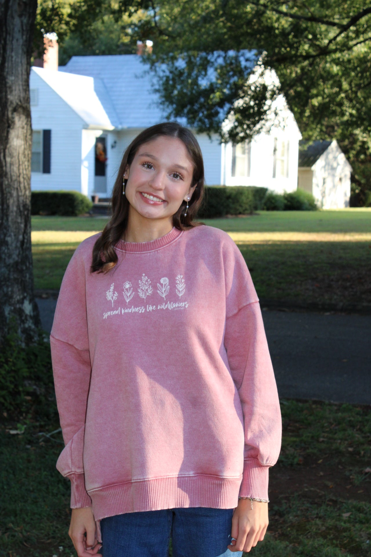 this "spread kindness like wildflowers" is a favorite!! rose acid wash, oversized cut, size down if between sizes. poly/cotton. screen printed.