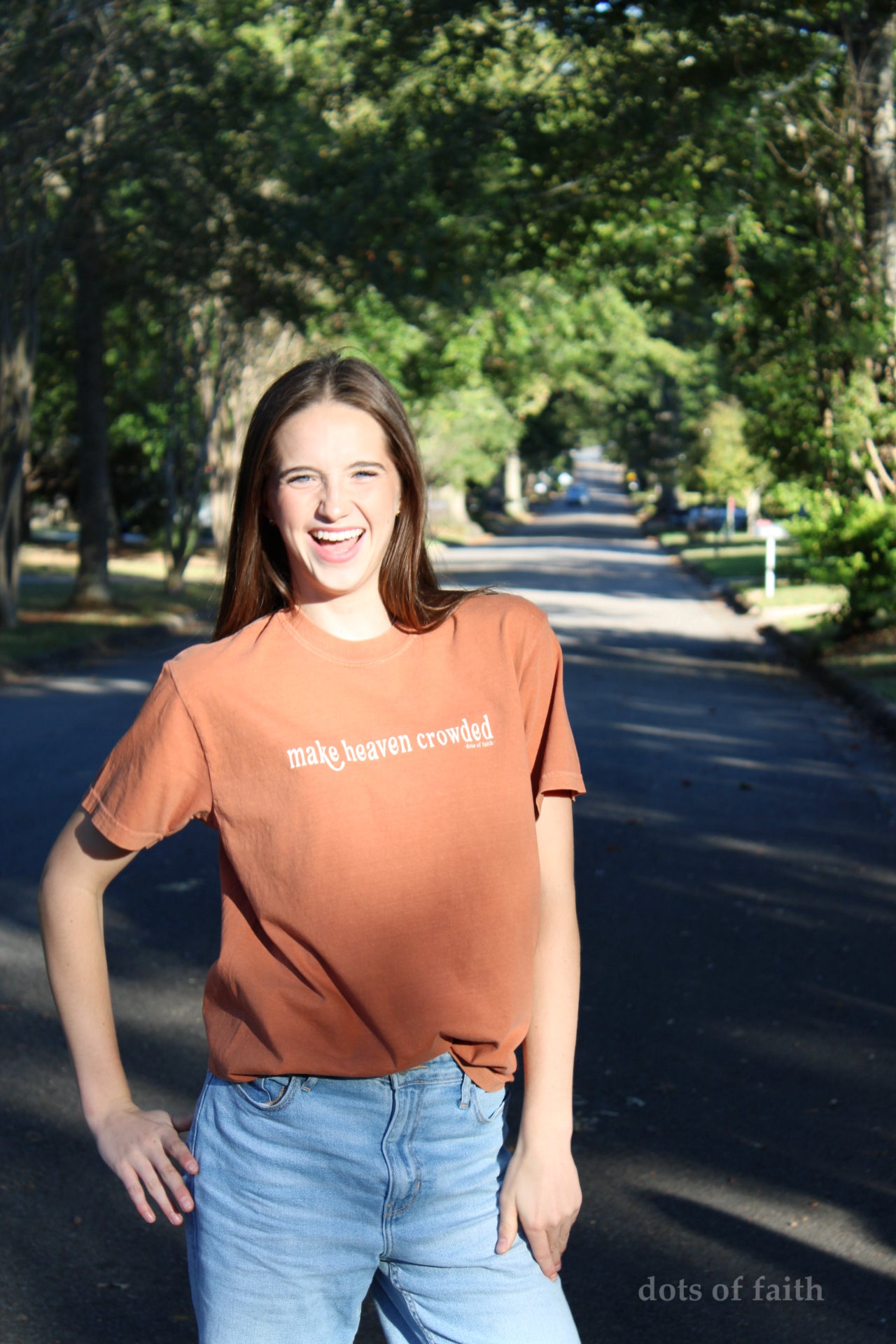 Experience effortless style and eternal purpose all in one. This Comfort Colors tee in a rich mustard shade features the bold and inspiring message “Make Heaven Crowded”—a daily reminder to live on mission and share your faith everywhere you go.